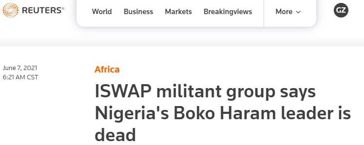 伊斯蘭國西非省證實 聖戰組織博科聖地首腦死亡 2021-06-07 0536 中央社 奈及利亞邁杜古利市6日綜合外電報導 伊斯蘭國.