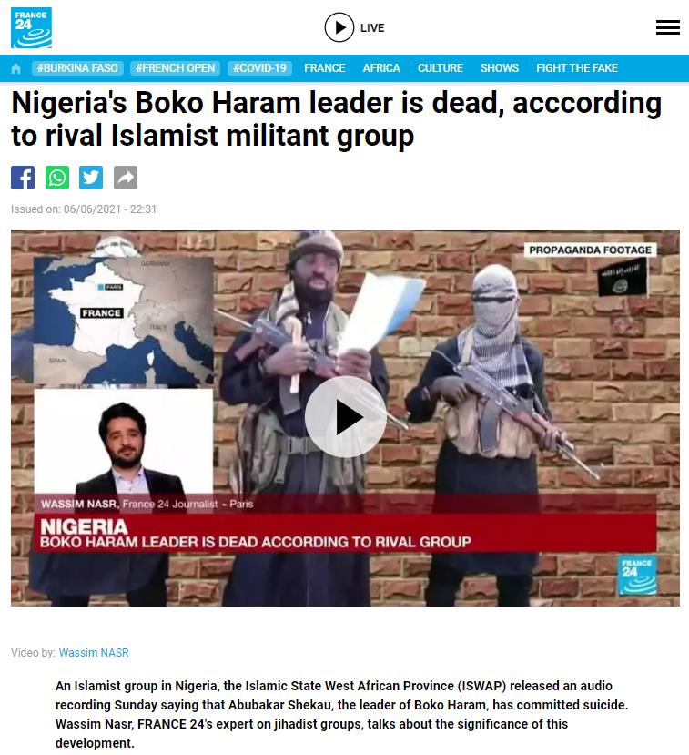 從恐怖組織博科聖地獨立出來效忠伊斯蘭國的西非省ISWAP 6日證實其主要競爭對手奈及利亞的博科聖地首腦謝卡Abubakar Shekau已喪命 根據路透取得聲音檔指出西非省領導人巴拿維Abu Musab al-Barnawi表示因不敵西非省成員追殺謝卡於5月18日引爆炸彈裝置. 博科聖地 奈及利亞 伊斯蘭國 謝考 Abubakar Shekau 恐怖組織 伊斯蘭.
