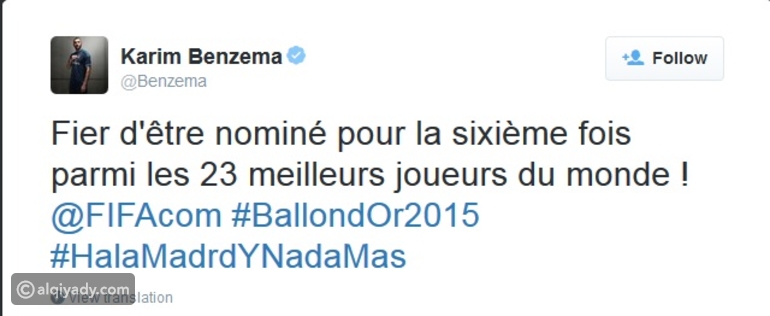 وعبر الحساب الرسمي لـ ريال مدريد على موقع تويتر غرد النادي. كريم بنزيما بعد مباراة ف. ومبروك للاعبنا الرائع كريم بنزيما الذي يستحق جائزة الكرة الذهبية.